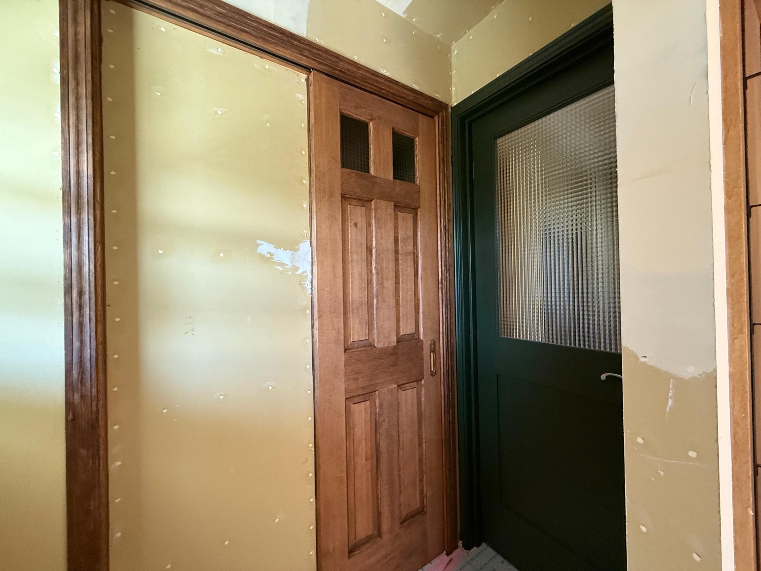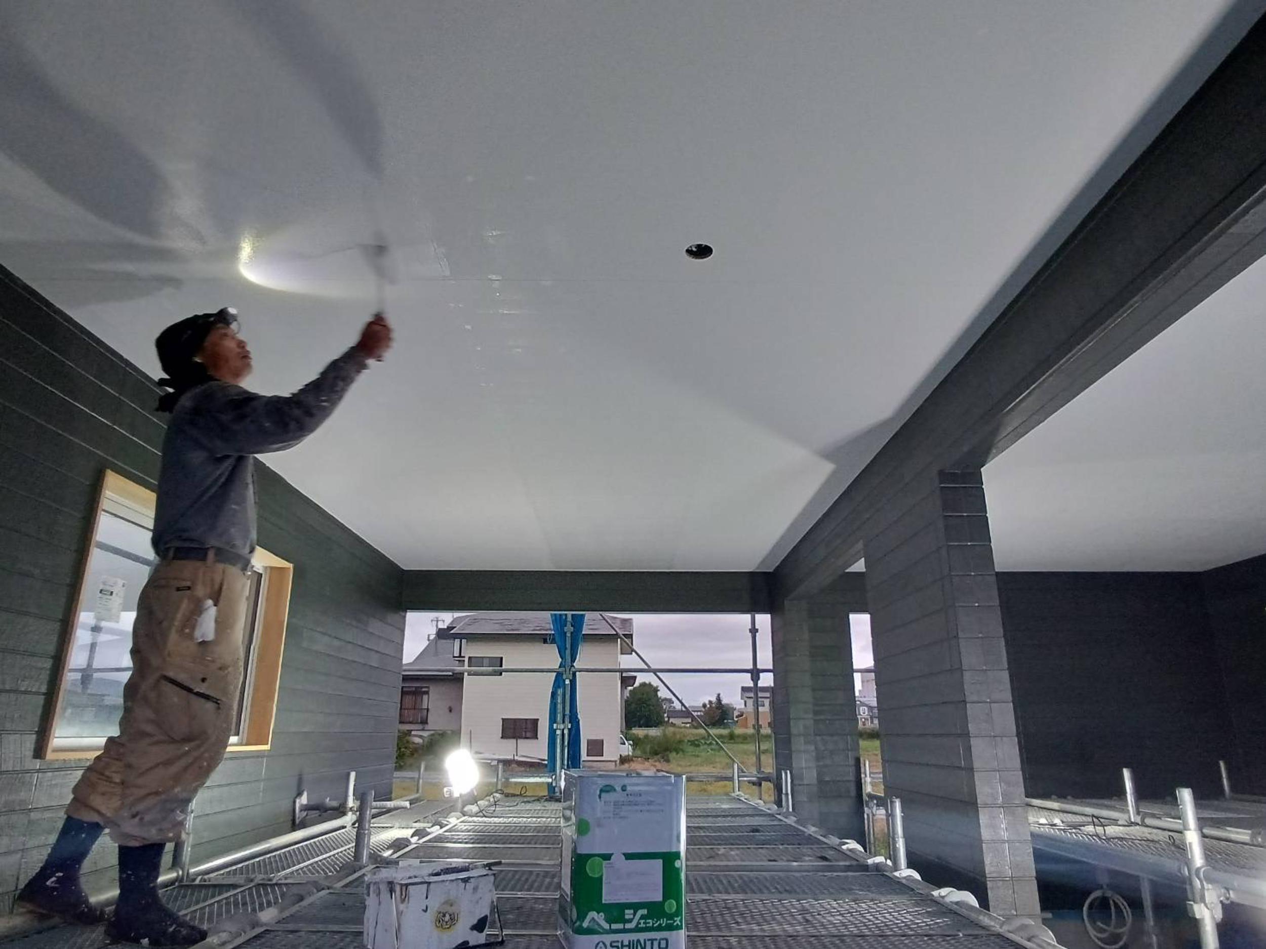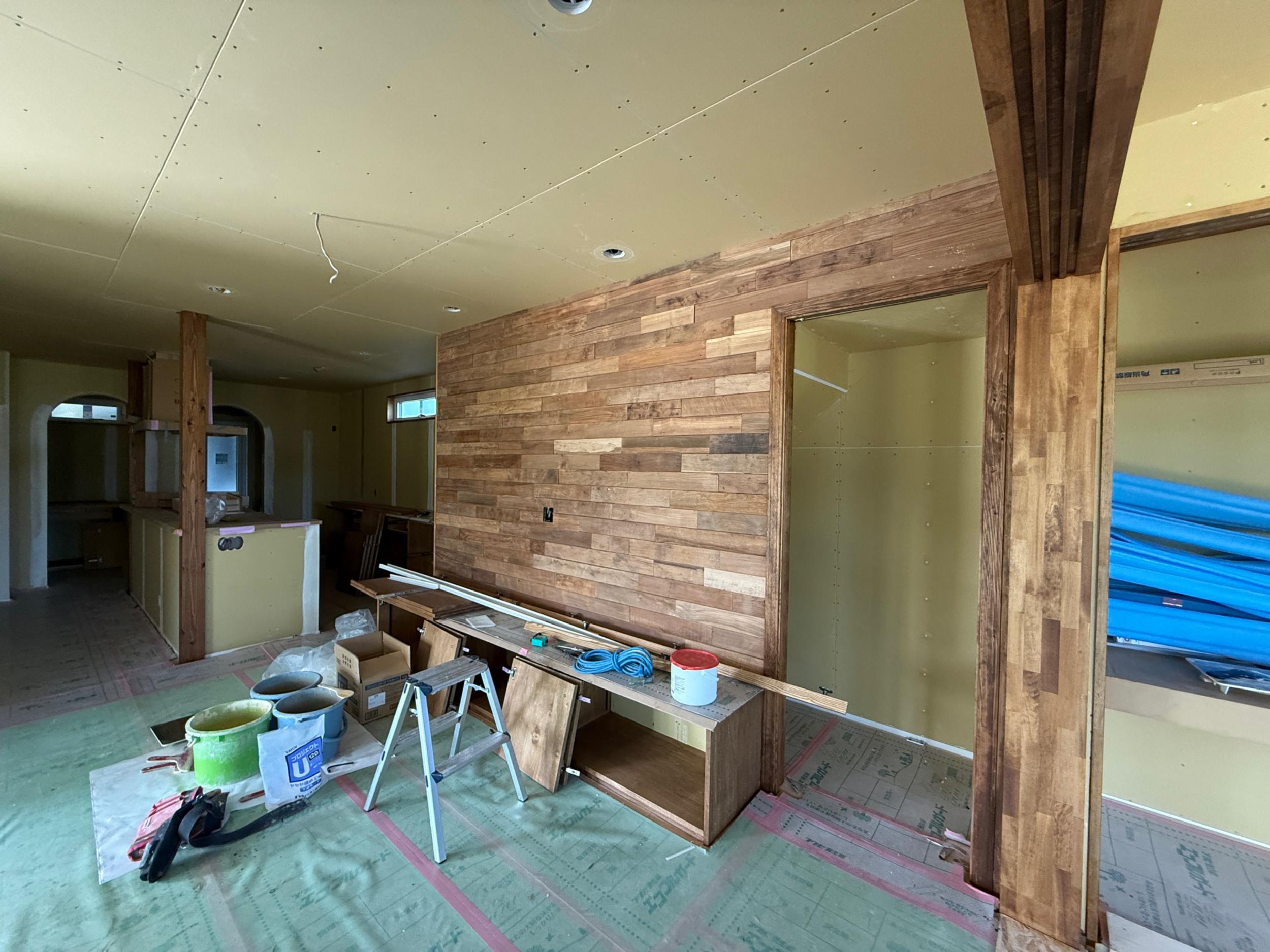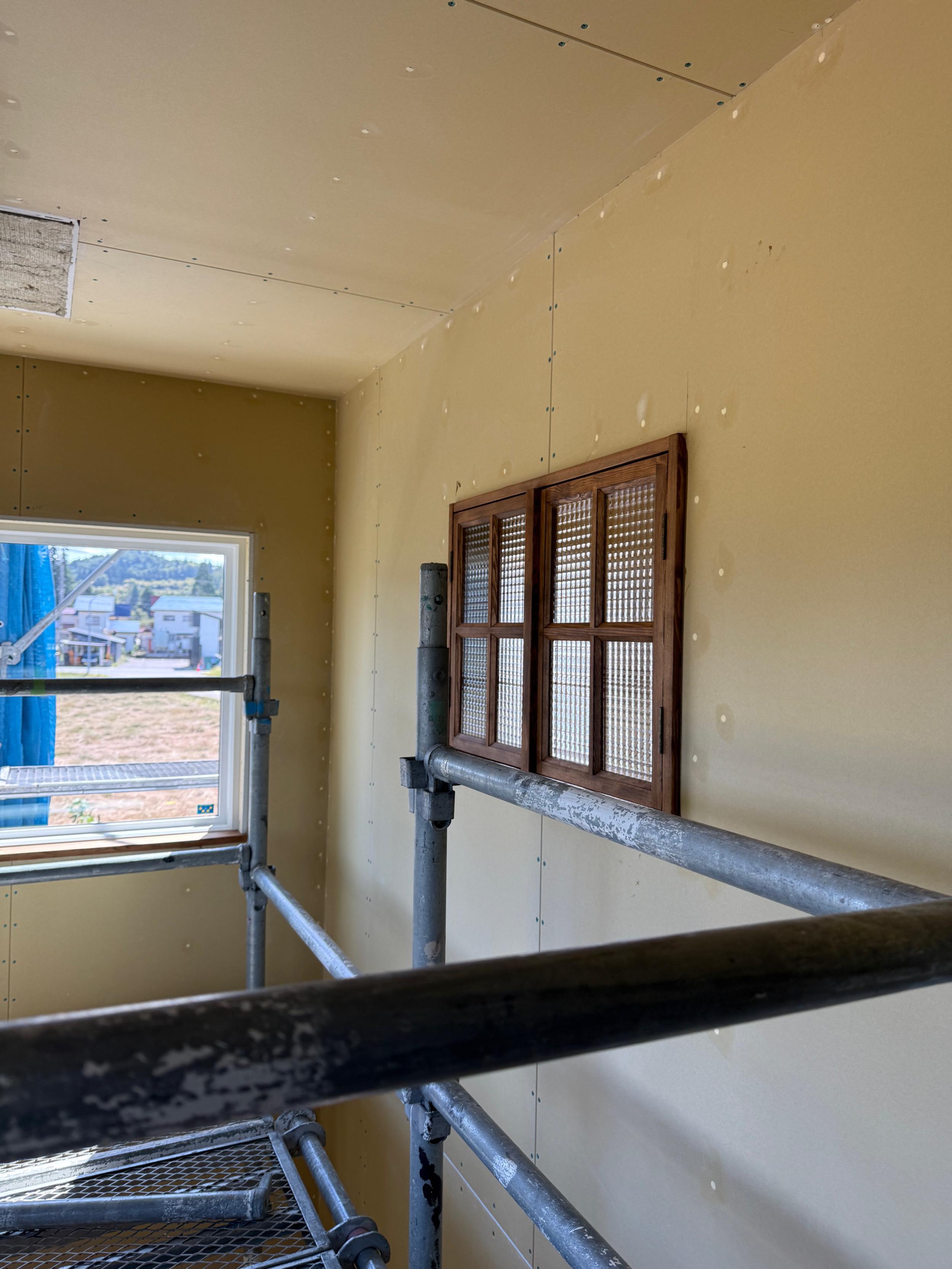 クロス屋さんが現場入りし、パテ処理が進行中です。