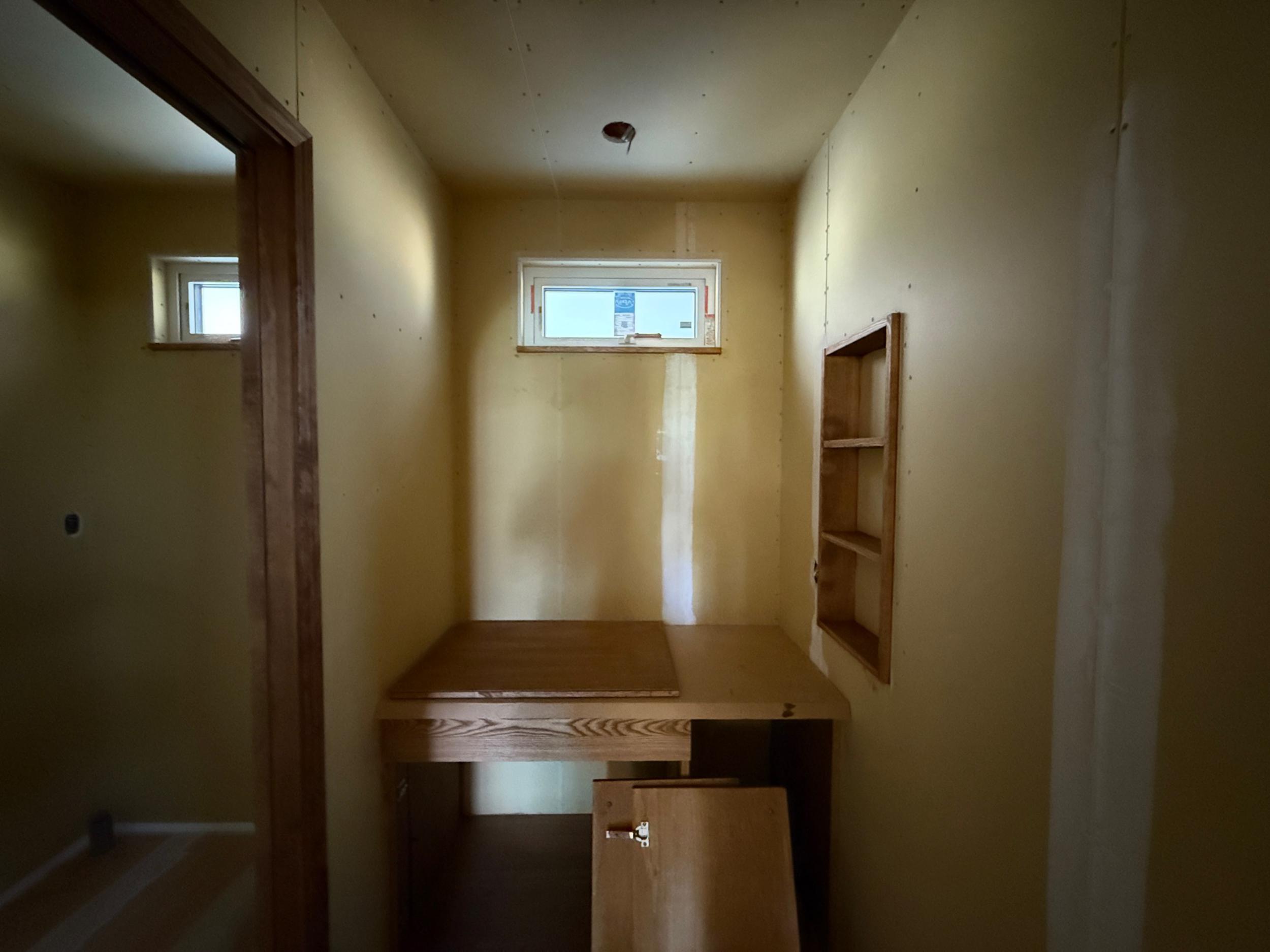 内部の木部はリボスのチェストナット色で仕上げます。室内窓や、